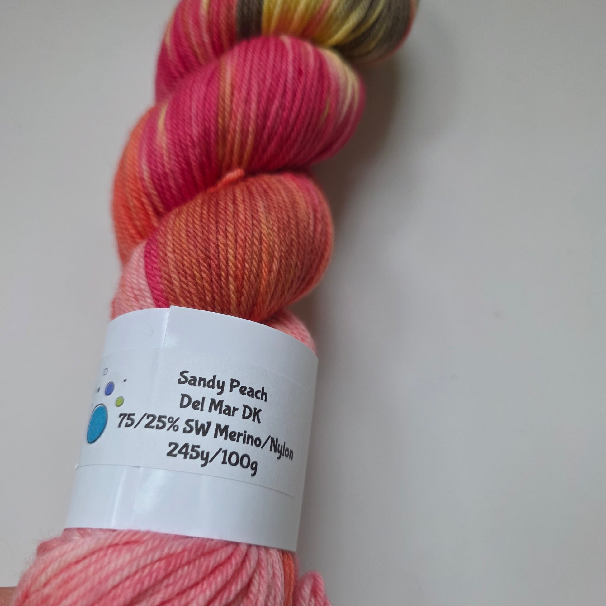 A breathtaking hand-dyed gradient yarn in the 'Sandy Peach' colorway, featuring a stunning transition from vibrant coral and hot pink through peachy tones to soft yellow and olive green. This Beach Bum Yarn creation captures the essence of a sunset over the ocean.