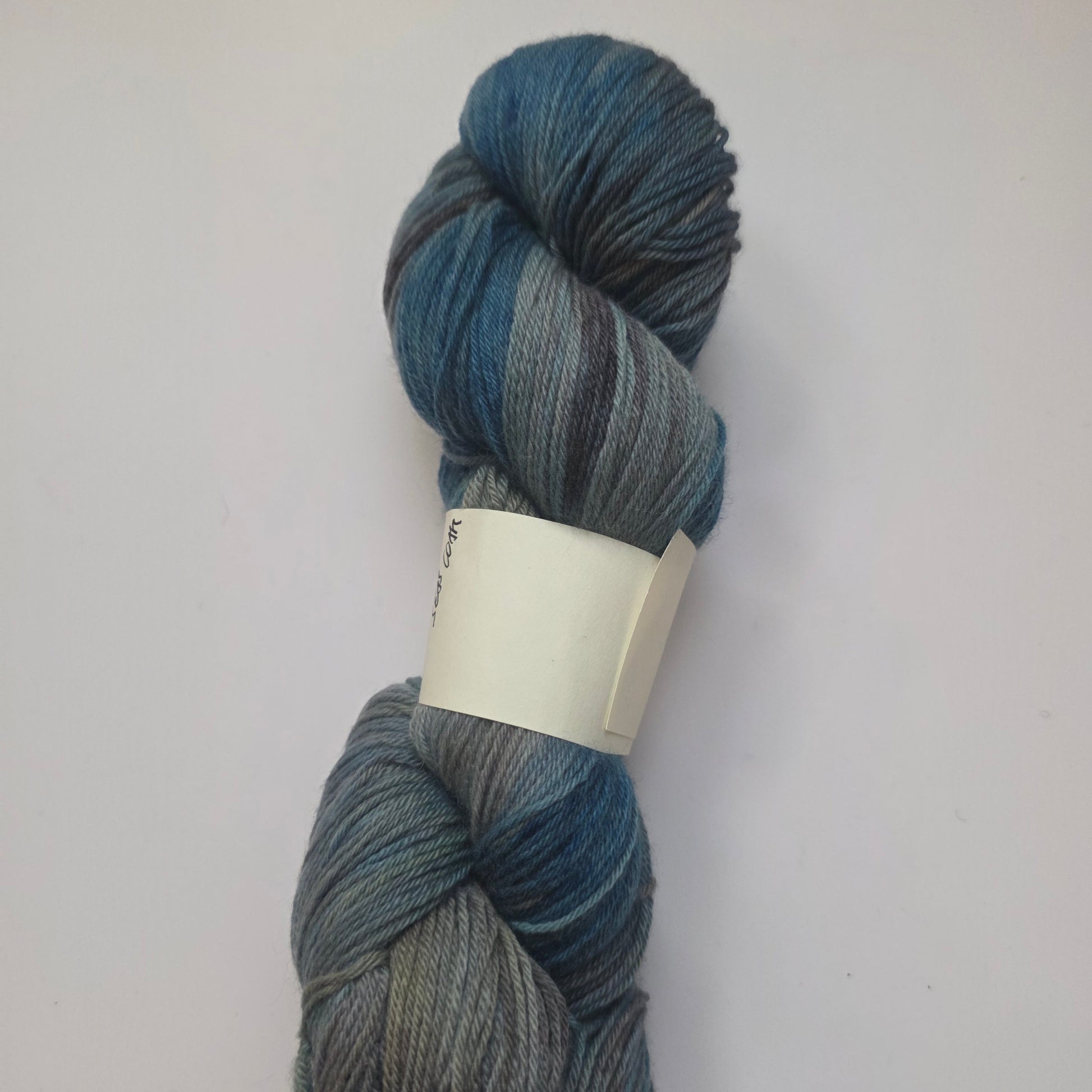 A sophisticated hand-dyed sock yarn in moody tones of teal, charcoal, and silver. The 'Demeter' colorway offers beautiful depth with its blend of cool blues and grays, creating subtle tonal variation perfect for showcasing stitch patterns.