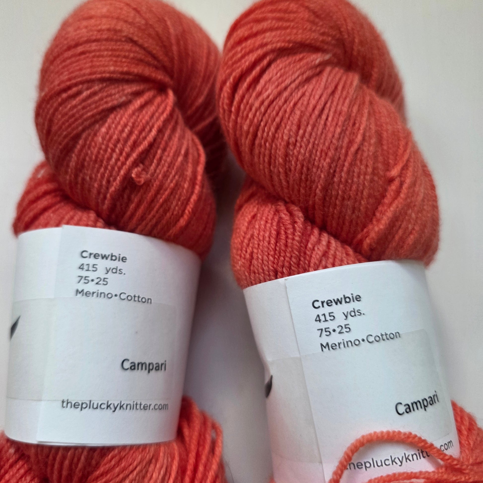Beautiful Crewbie fingering weight yarn in a vibrant coral-red tone. This soft merino-cotton blend offers excellent stitch definition and breathability, making it ideal for shawls, socks, and lightweight garments that transition beautifully between seasons.