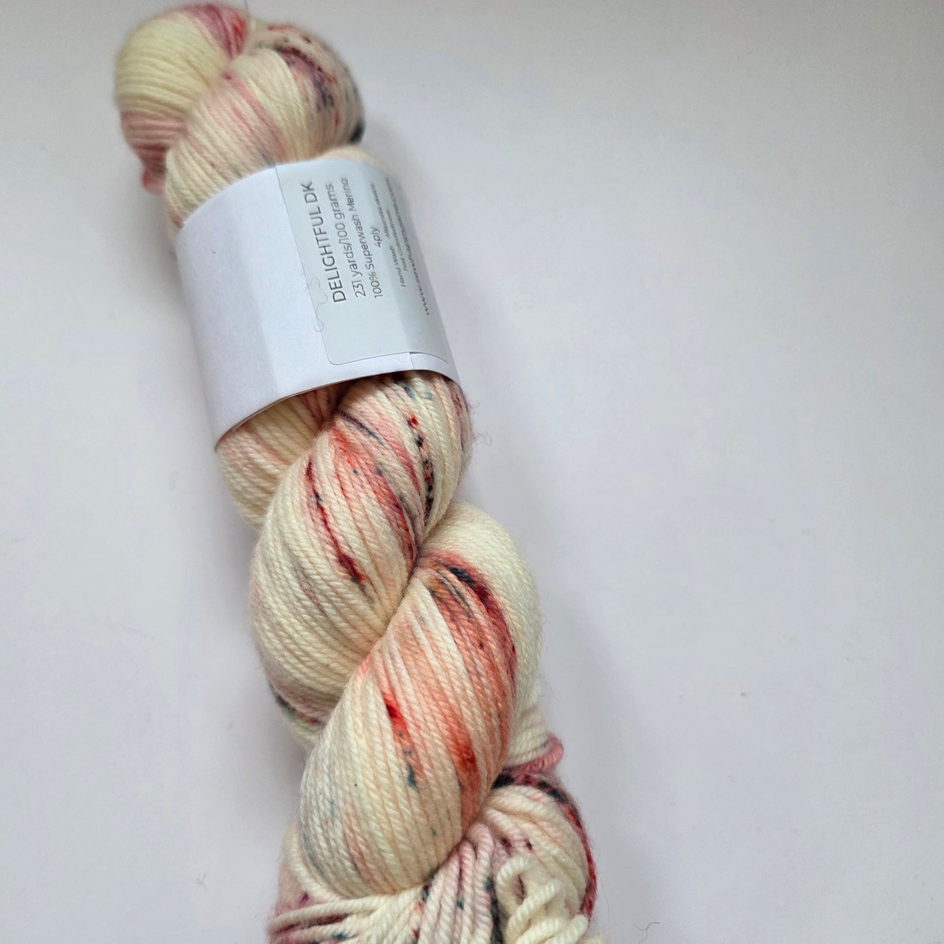 A stunning hand-dyed DK weight yarn in soft cream tones with delicate rose and mauve speckles. This luxurious 100% Superwash Merino is perfect for your next shawl, sweater, or accessory project.