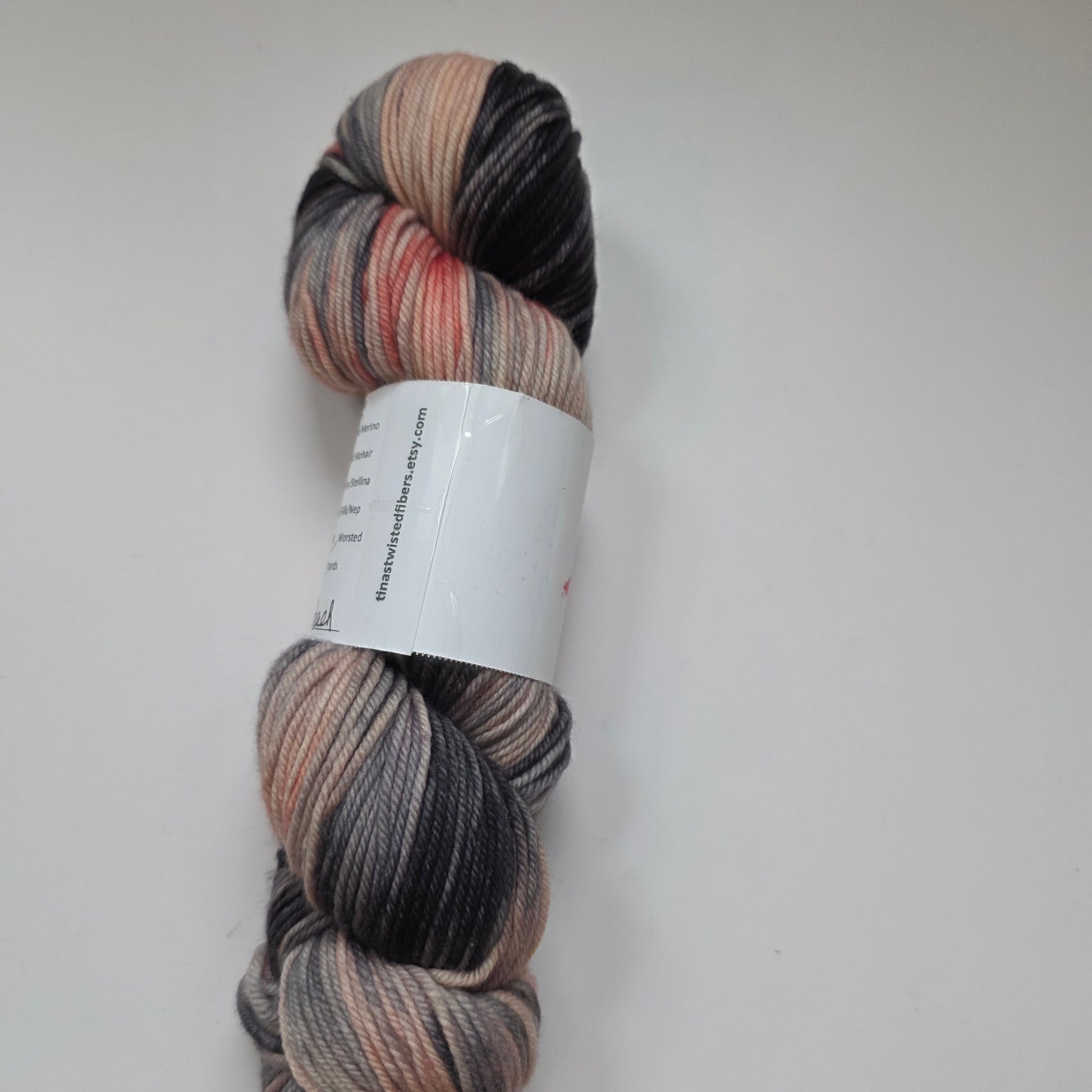 Luxurious hand-dyed yarn in the Priscilla Peach colorway featuring soft peach and coral tones transitioning through gray to deep charcoal.