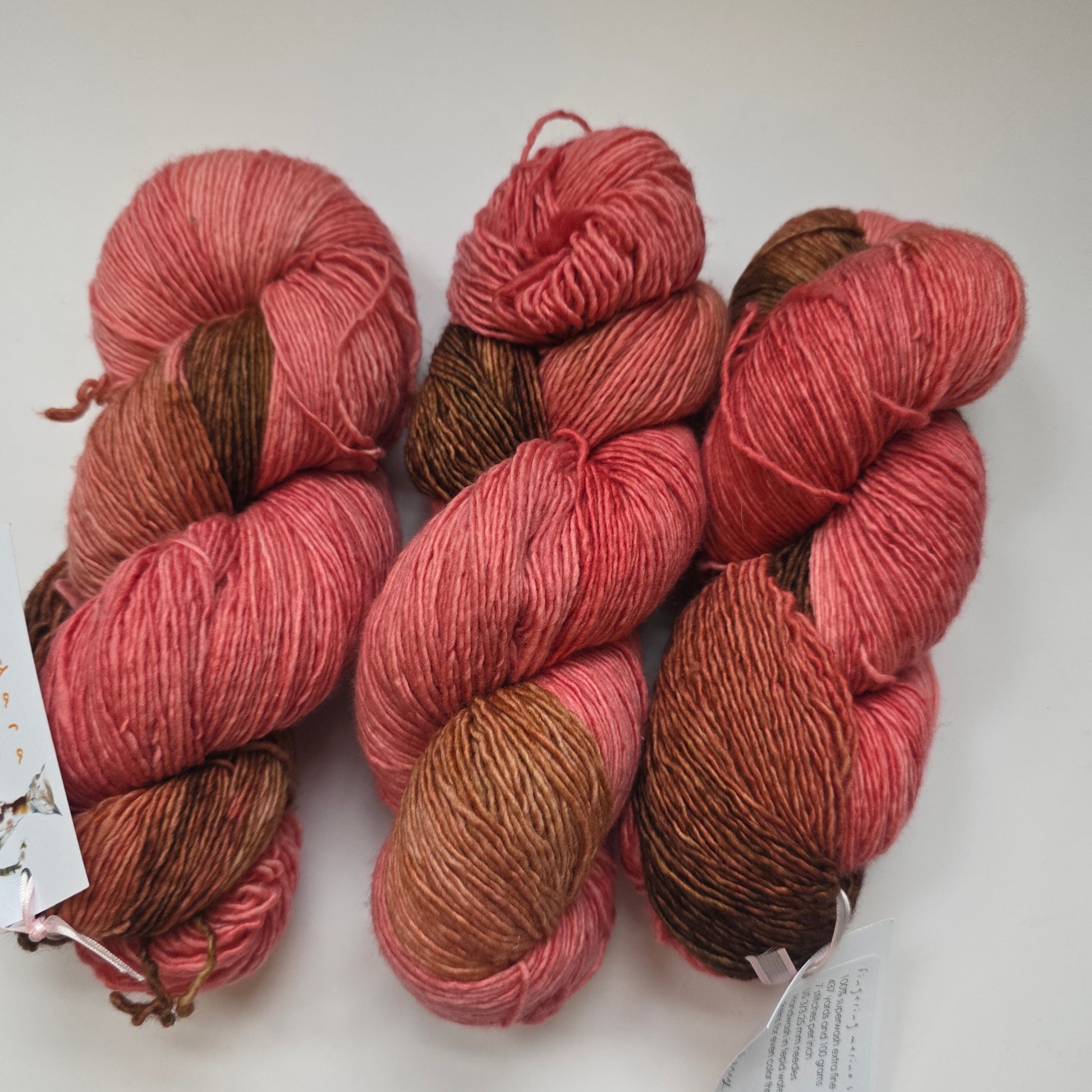 Stunning Sundara hand-dyed fingering weight yarn in the Cherry Blossom colorway, featuring beautiful coral-pink tones with rich chocolate brown accents. This luxurious extra fine merino from Sundara creates a sophisticated variegated effect perfect for shawls, socks, and lightweight garments.