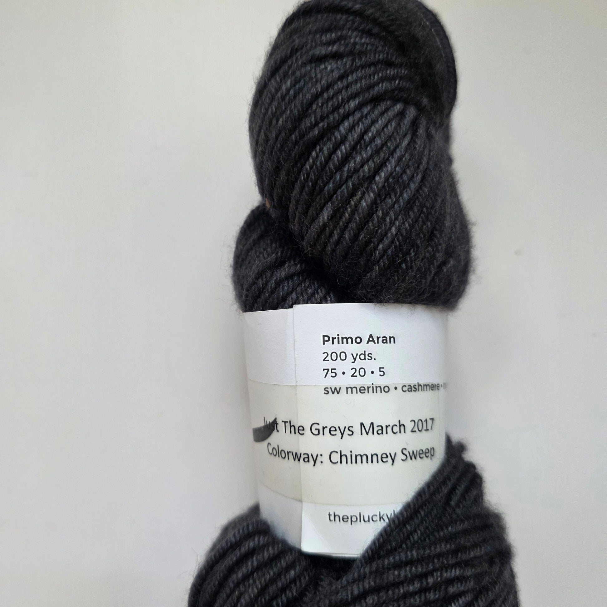 Sophisticated Primo Aran yarn in the timeless 'Chimney Sweep' colorway—a rich, deep black with subtle tonal variations that create depth and elegance in every stitch.
