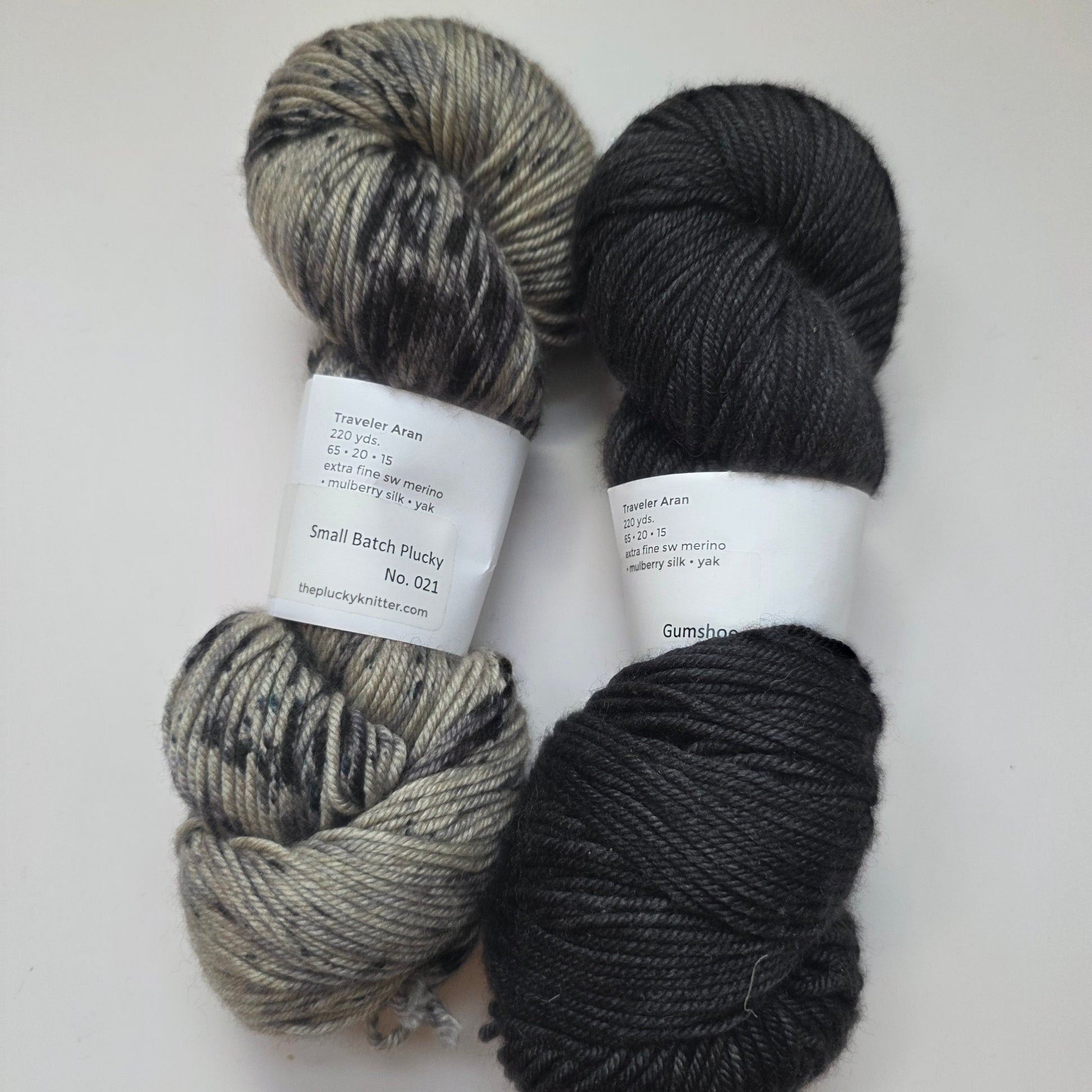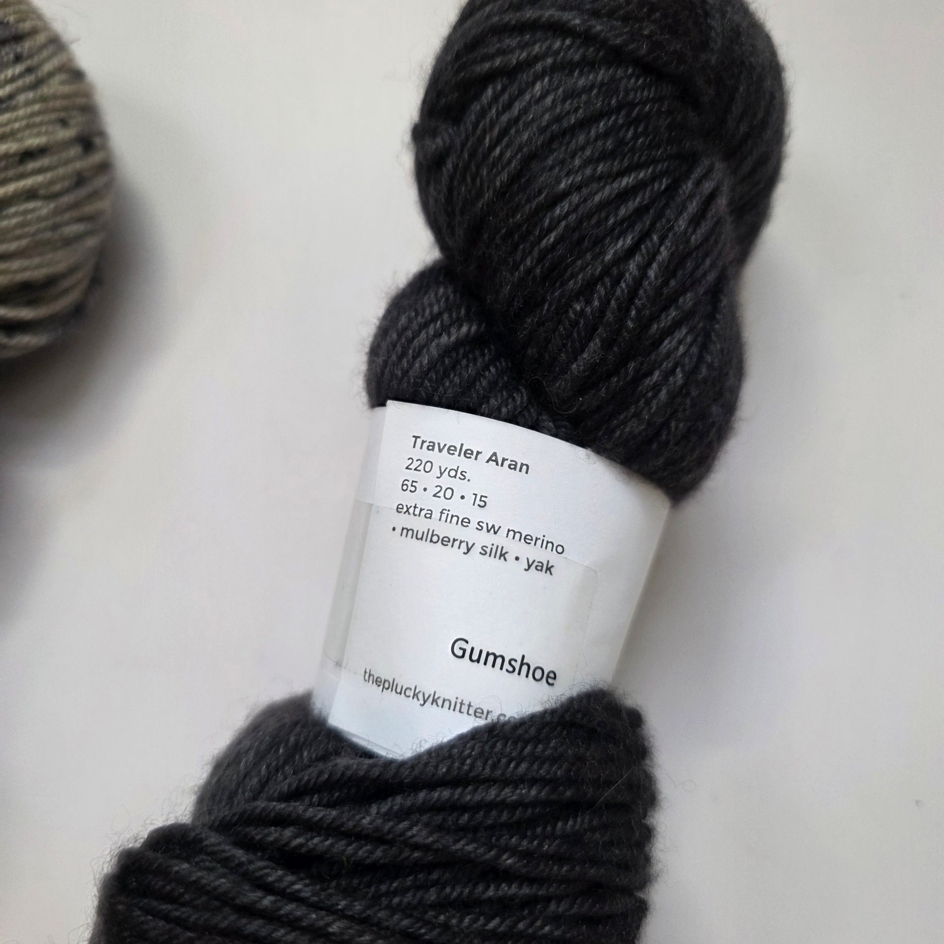Exquisite Traveler Aran yarn in the exclusive 'Small Batch Plucky No. 021' colorway—a sophisticated blend of charcoal, slate grey, and warm taupe tones that create a beautifully variegated, organic aesthetic.